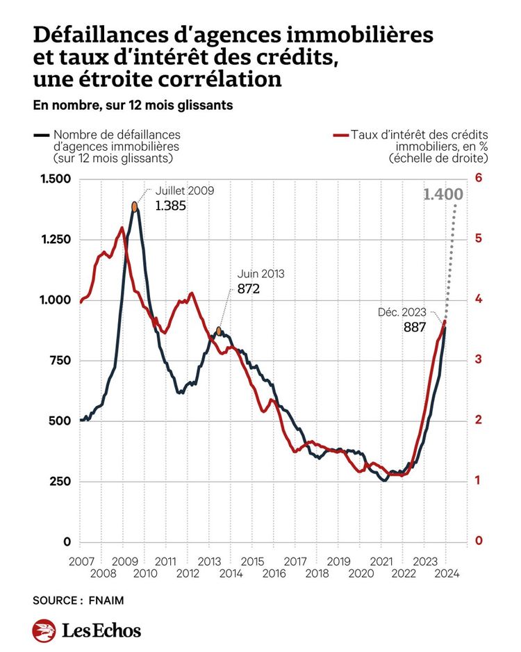 Et bonne année surtout ! Et quoi de mieux pour bien démarrer qu’un coup de rétroviseur sur cette fameuse année 2023 qu’on nous avait prédit atroce dans l’immobilier. Et bien … elle a tenu ses promesses avec un nombre de défaillances d’entreprises assez colossal. 57 729 défaillances en 2023 soit une hausse de 36% après une année 2022 pas fameuse avec un rattrapage post COVID de +44%. Le cabinet Altares dresse un portrait des entreprises sans appel et avec un focus sur l’immobilier c’est +40% sur un an.